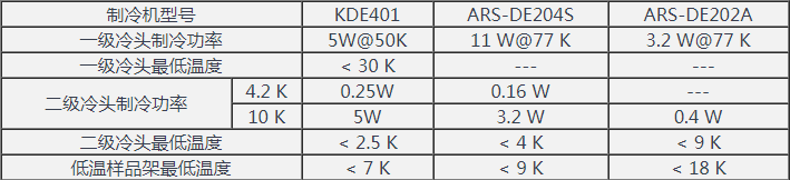 附:費(fèi)密儀器基于不同閉循環(huán)制冷機(jī)的低溫樣品架的溫度指標(biāo)