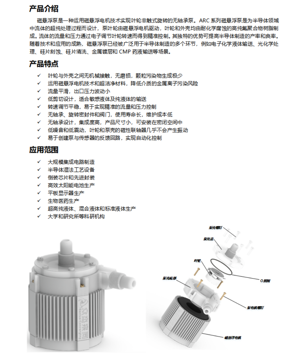 磁懸浮泵是一種運用磁懸浮電機技術實現葉輪非觸式旋轉的無軸承泵,ARC系列磁懸浮泵為半導體領域中流體的超純處理過程而設計,泵葉輪由磁懸浮電機驅動、葉輪和外殼均耐化學腐蝕的高純氟聚合物樹脂制成,流體的流量和壓力通過電子調節葉輪轉速而得到精確把控,其獨特的優勢可提高半導體制造的交率和良率,隨著技術和應用的成熟,磁懸浮泵已經被普遍的應用于半導體制造的多個環節,例如:電子化學液體輸送、光化學處理、硅片刻蝕、硅片清洗、金屬鍍層等場景;