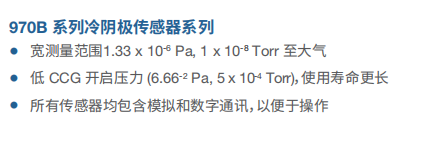 MKS 提供范圍寬廣的冷陰極產(chǎn)品。970B 系列為緊湊型、低成本、通用型傳感器系列,采用一至三種傳感器 - 冷陰極、MicroPirani"和壓電技術(shù)。結(jié)合這些傳感技術(shù),可實現(xiàn)從 10-6 Pa 到大氣的大測量范圍。除了體積小、范圍廣和成本低之外,970B 系列還可以通過數(shù)字通訊或作為自主模擬單元進行操作。該系列包括三種換能器型號,971BUniMag”(冷陰極)、972B DualMag" MicroPirani/(冷陰極)和974B QuadMag"(Piezo/MicroPirani冷陰極)。選件包括本地顯示屏和設(shè)定值繼電器。